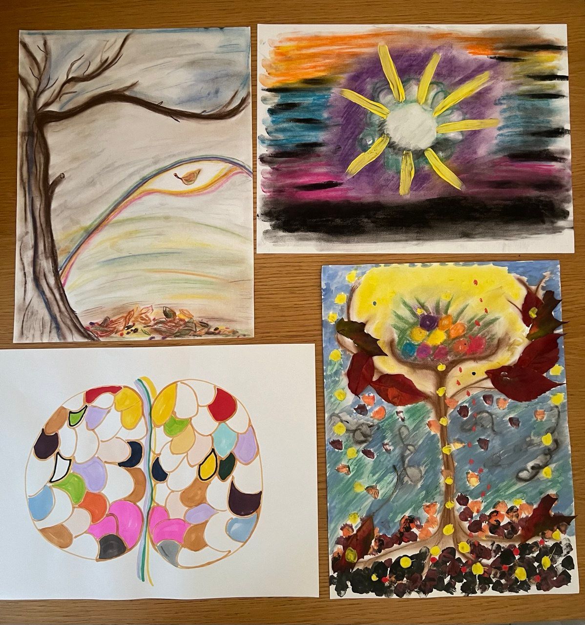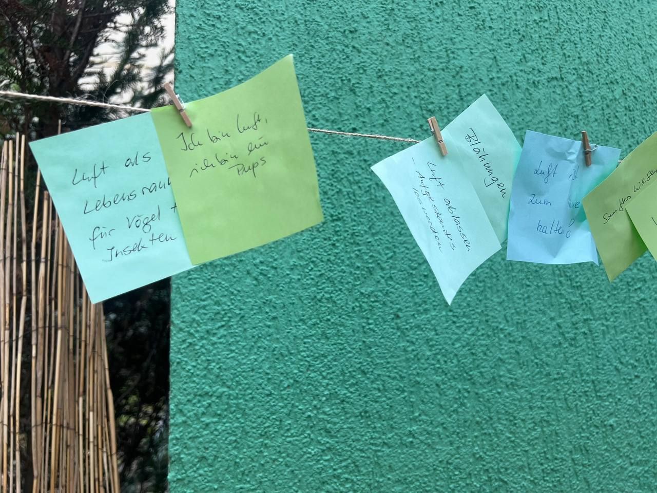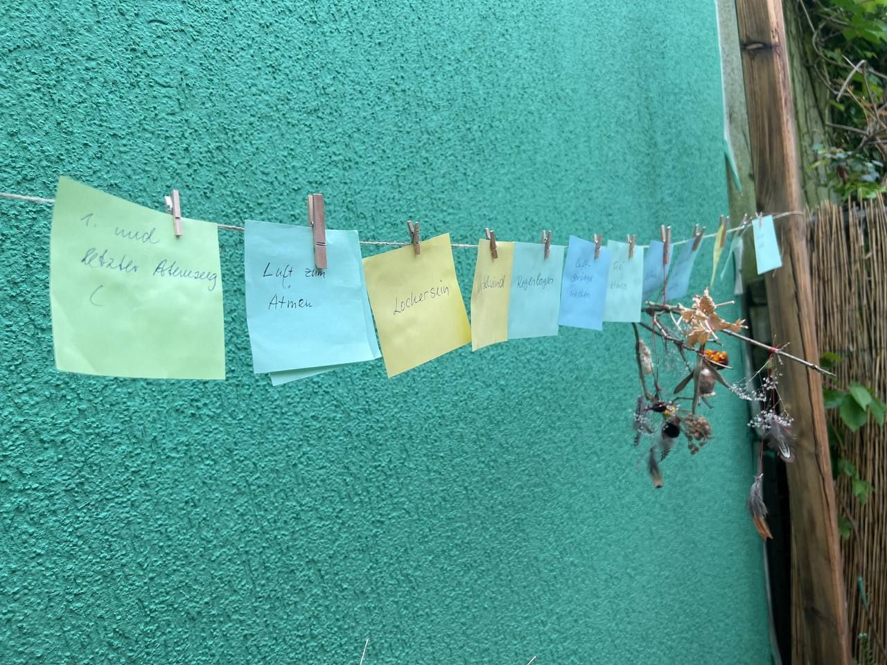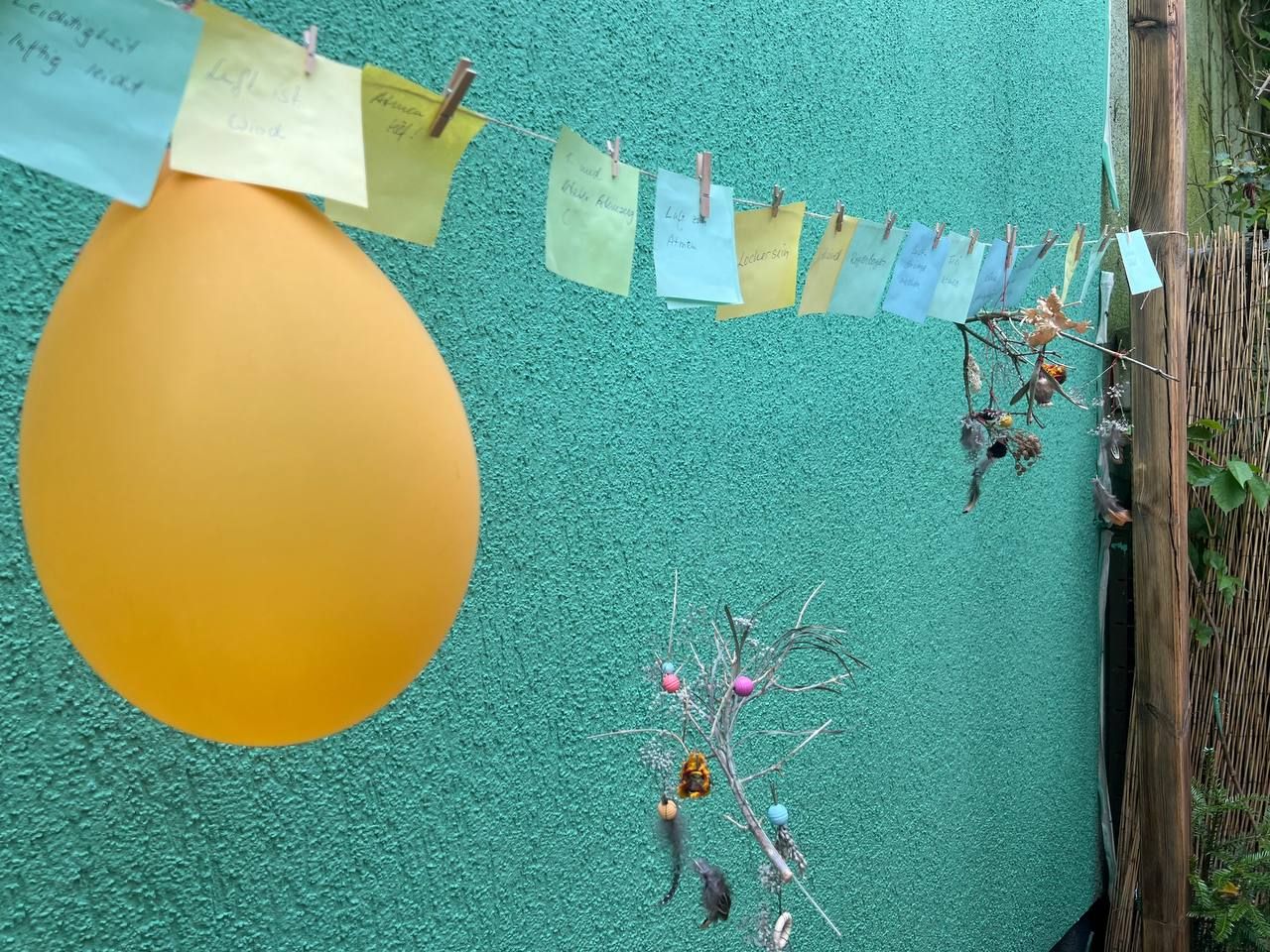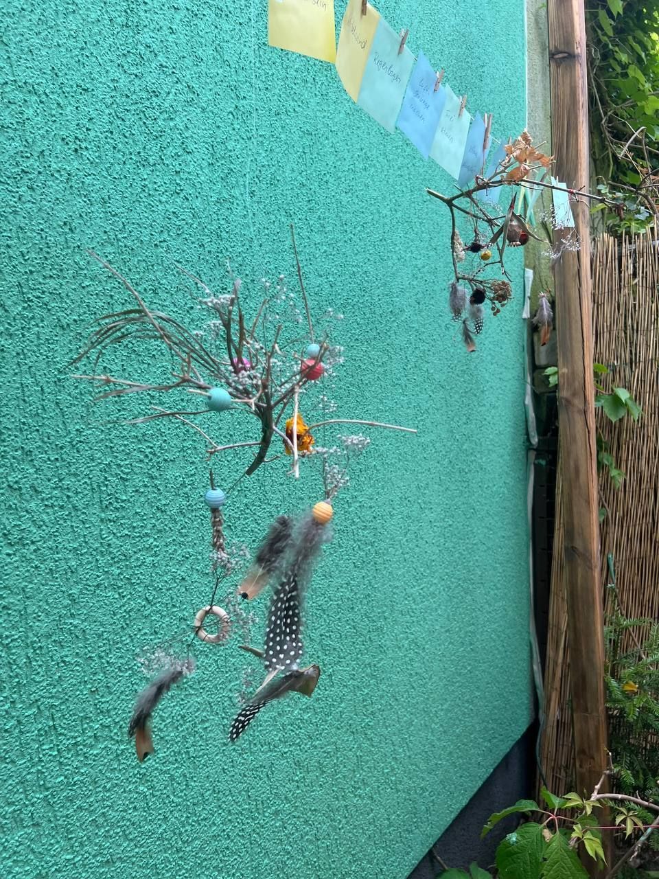 Gemeinsam sammelten wir u.a. die Eigenschaften der Luft, die dann im Wind flattern durften, haben um die Wette Seifenblasen fliegen lassen, waren dankbar, dass der Wind die Regenwolken in eine andere Richtung als unsere gelenkt hat, machten gemeinsam eine Atemmeditation und am Ende entstanden wundervolle Windspiele.