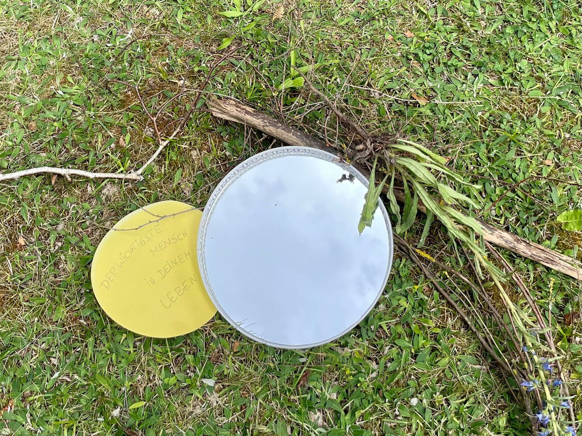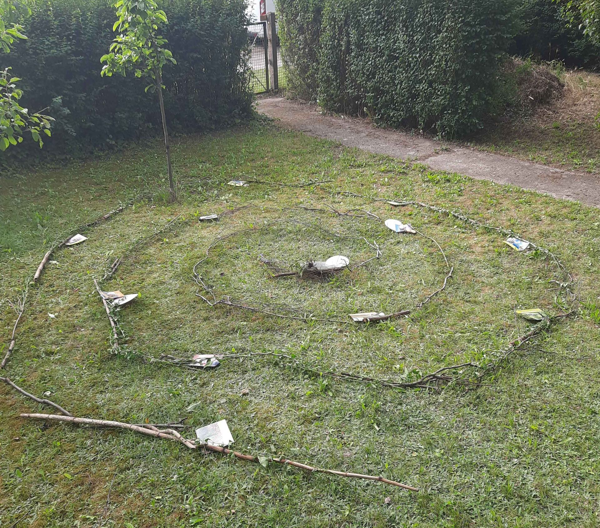 Im Bild ist ein Labyrinth aus Naturmaterialzu sehen, welches Zeit zum Innehalten bot. In der Mitte konnte im Spiegel lächelnd der wichtigste Mensch im eigenen Leben betrachtet werden.